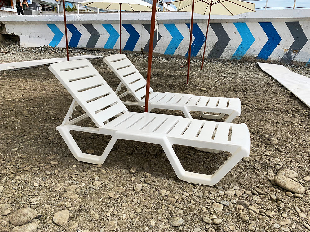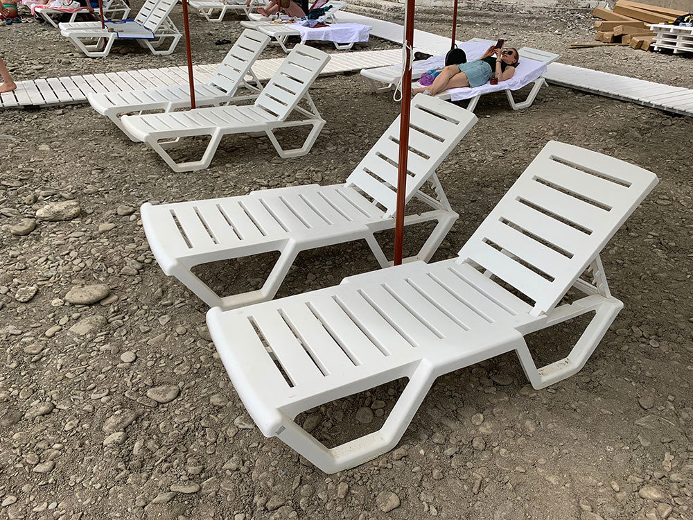 Универсальный шезлонг с тщательно продуманным дизайном, который подходит для размещения как любом виде покрытия пляжей. Устойчивы и не ломки, не проваливаются и не деформируются от неровной поверхности. На пляжах с покрытием пляжа галькой, шезлонги показали себя устойчивыми и не изменяющими своего первозданного вида. На песчаных пляжах они не проваливаются в песок и не застревают в нем.