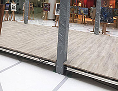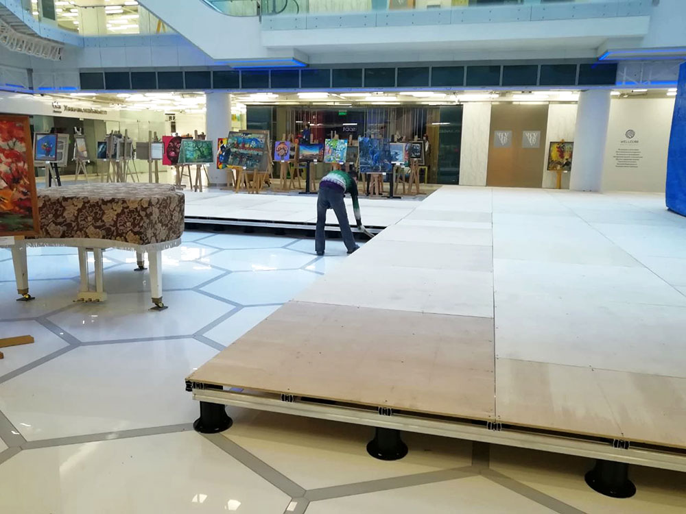 В режиме монтажа в ТЦ, сразу отпадает масса проблем.... например выравнивание поверхности и заливка бетонной стяжки. На готовой площадке можно сразу монтировать поверхность, и достаточно использовать опоры и лаги... Опоры выбрали пластиковые, они прочные и надежные, а плюсом у них является то, что они имеют выдвижной механизм и могут регулировать высоту и уровень до миллиметра! После установки опор, на них кладут лаги.. выбирая либо из металла, либо из дерева... А уже поверх лаг укладывают террасную доску, с использованием кляймеров и различных крепежей.